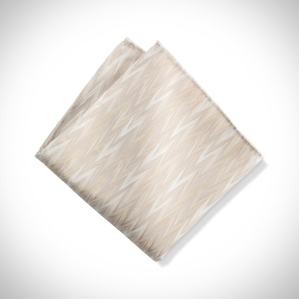 The zig zag pattern and subtle texture of this champagne pocket square adds a modern energy and traditional charm to any look, especially when it’s coordinated with its matching bow tie.
