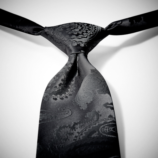 This black tie features an exotic paisley jacquard pattern on an iridescent background, and can be worn by itself or with a matching vest. Black is the most classic color choice for any formal look and will always be in style.