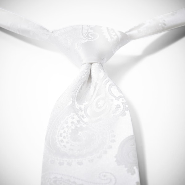 This white paisley tie features an exotic paisley jacquard pattern on an iridescent background, and can be worn alone or with a matching vest. White is a peerless selection for celebrating a new beginning, and lends virtue to any ensemble.